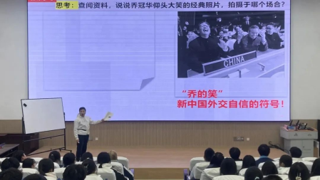 在本次示范课活动中,鲁老师以展示相关国际组织标志为导入,以“乔的笑”经典照片为切入点引出本节课的重点内容——中国与联合国,围绕这一重点内容开展了课堂教学。教学目标明确,教学环节设计新颖、巧妙且完整,师生互动活跃,课堂氛围轻松愉快。同时,在课堂教学过程中鲁老师根据教学内容穿插了高考仿真题练习,让学生进一步加深对本节课重点内容的理解和巩固,并按照学情进行分层式作业布置。